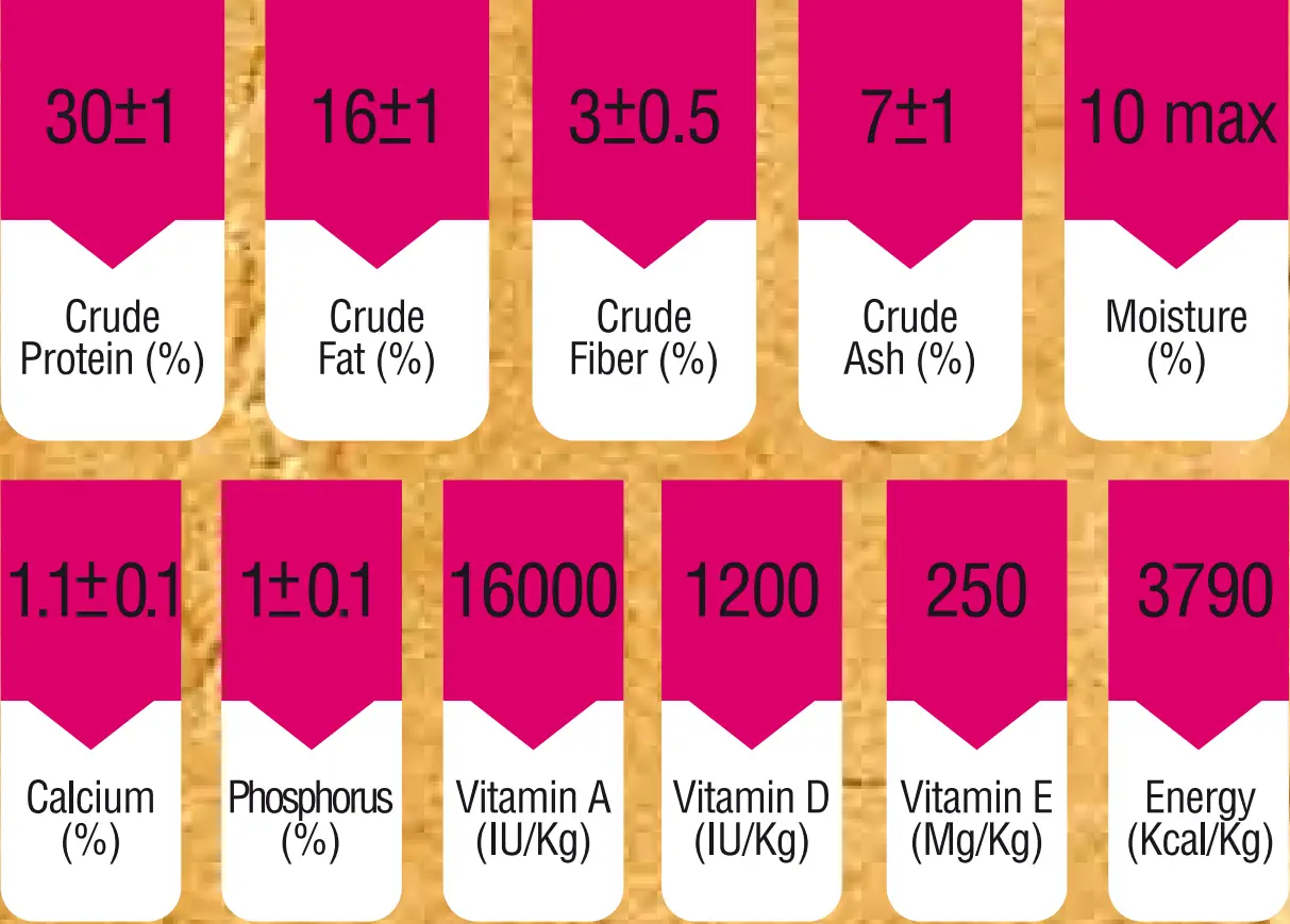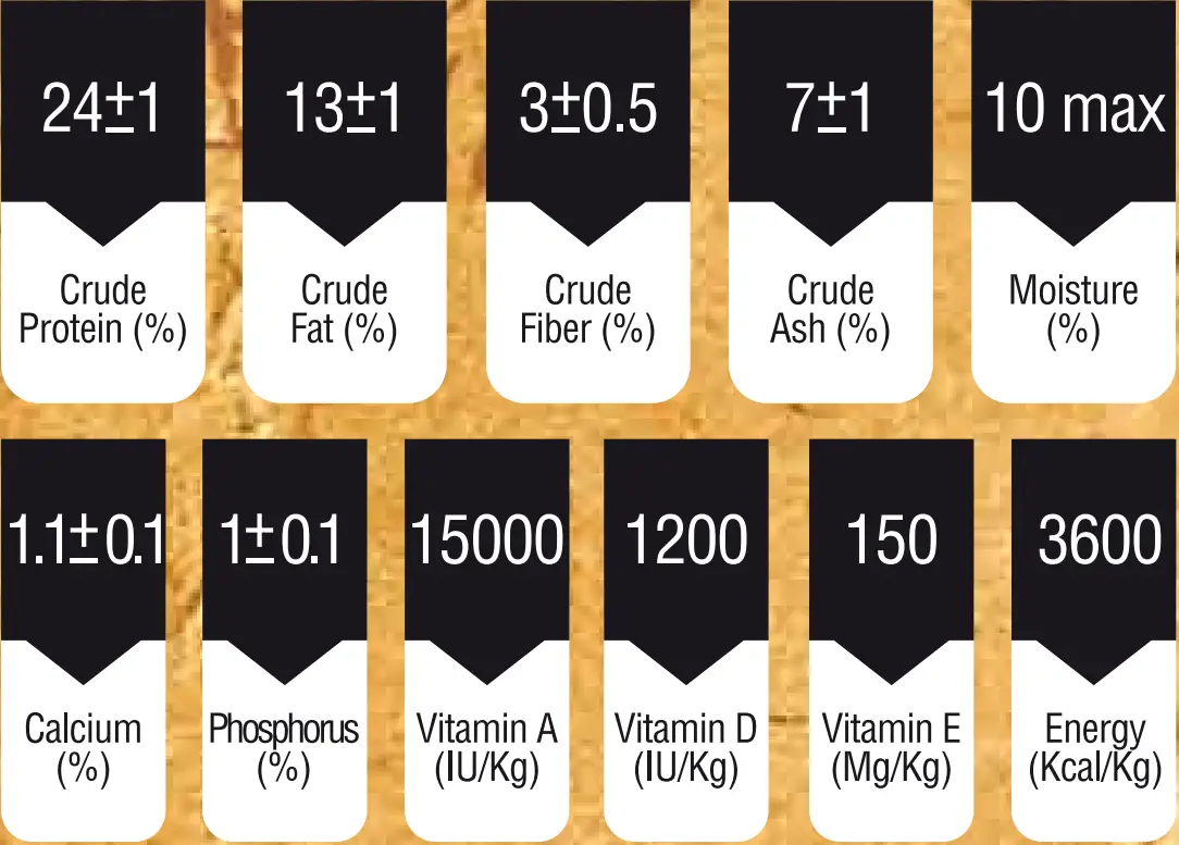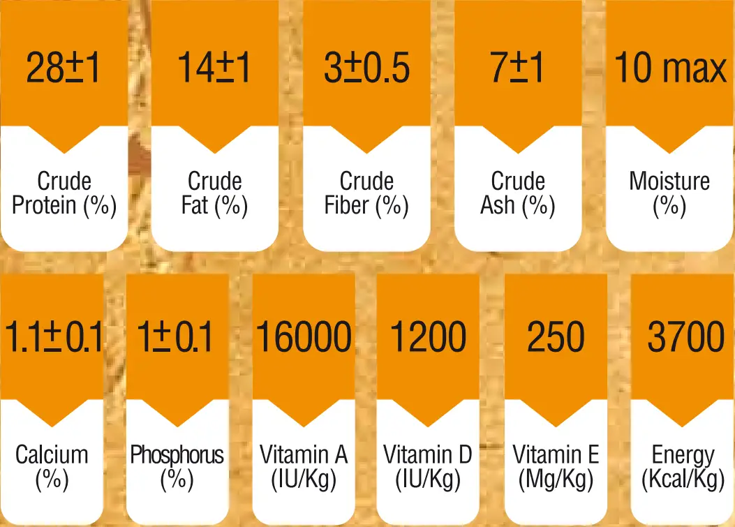مجموعه کامل ویتامینها (A، D3، E، K3، B1، B2، B3، B6، B12، بیوتین، اسید فولیک، C)، اسیدهای آمینه (لیزین، متیونین، ترئونین)، تورین، کولین کلرید، مواد معدنی (آهن، مس، منگنز، ید، فسفر، کلسیم، روی، سلنیوم)، پروبیوتیکها، پریبیوتیکها، آنتیاکسیدانها و طعمدهندههای طبیعی میباشند.